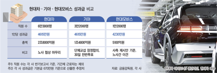 이에 현대차가 직원들에게 지급할 성과급 총액은 2조8000억원, 기아 1조4800억원 등으로 각각 추산된다. 총액 4조3000억원으로, 올 상반기 현대차ㆍ기아 합산 순이익(12조4060억원)의 35%에 해당한다.