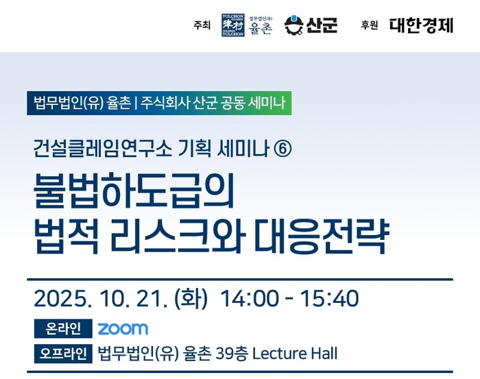 [대한경제=이승윤 기자] 법무법인 율촌 건설클레임연구소(소장 이은재ㆍ정유철)는 ㈜산군과 함께 다음 달 21일 오후 2시 서울 강남구 삼성동 파르나스타워 39층 율촌 렉쳐홀에서 ‘불법 하도급의 법적 리스크와 대응 전략’을 주제로 6번째 기획 세미나를 개최한다.