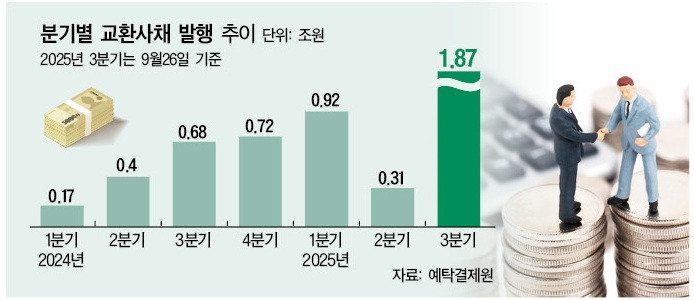 올해 3분기 들어 교환사채 발행이 급증하는 모습이다. 올해 들어 교환사채는 3조1129억원이 발행됐는데, 3분기에 무려 60%가 집중됐다.