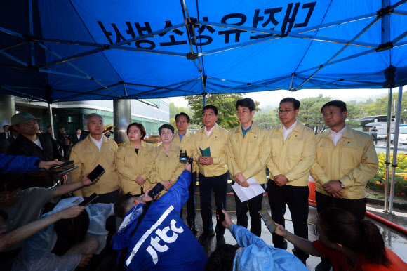| 국회 행정안전위원장인 더불어민주당 신정훈 의원과 행안위 위원들이 28일 대전 유성구 국가정보자원관리원 화재 현장을 방문해 피해 상황 등을 살핀 뒤 발언하고 있다./사진:연합 |