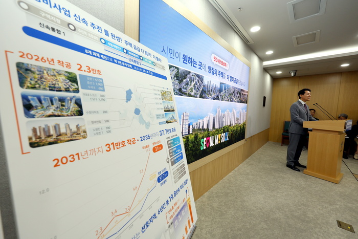 오세훈 서울시장이 29일 서울시청 브리핑룸에서 재개발ㆍ재건축 정비사업 기간을 최대 6.5년 단축해 2031년까지 31만호 착공을 골자로 한 서울시 주택공급 대책을 발표하고 있다.