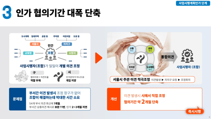 사업시행계획인가 단계에서 발생한 갈등을 시에서 직접 조정하겠다는 조치가 대표적이다. 그도 그럴 것이, 사업시행계획 인가 협의는 조합이 본청(도시계획, 임대주택, 공원) △자치구(주차장, 어린이집, 도로) △교육청, 소방서 등 54개 부서를 일일이 개별적으로 접촉해 조정해왔다. 시는 이견이 발생할 경우, 통합조정회의를 통해 직접 문제를 해결할 계획이다. 이 제도가 즉시 시행되면, 협의기간은 최소 2개월 단축될 전망이다.