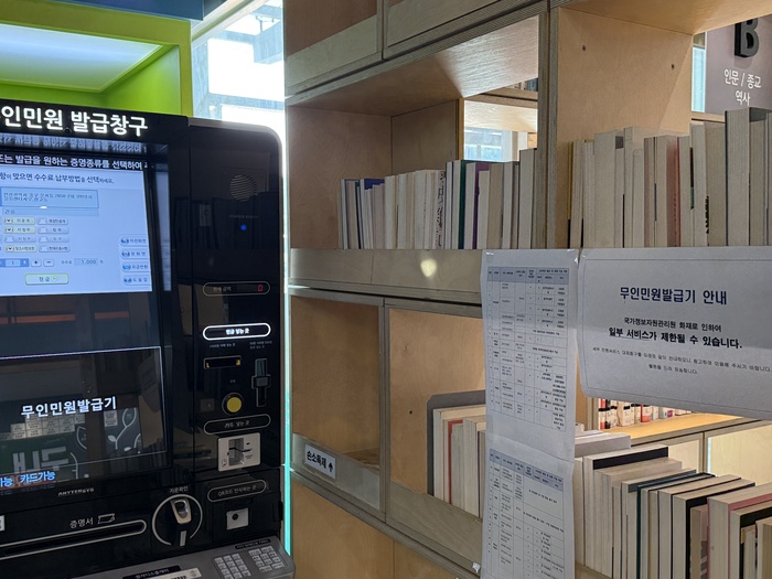 서울 시내 한 구청에 설치된 무인민원에 일부 서비스가 제한될 수 있다는 안내문이 부착돼 있다. /사진 : 박호수 기자 |