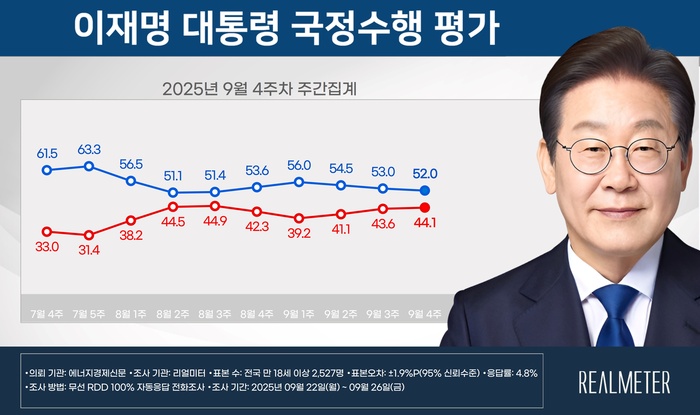 리얼미터가 에너지경제 의뢰로 지난 22~26일 전국 만 18세 이상 유권자 2527명을 대상으로 조사(표본오차 95% 신뢰수준에 ±1.9%p, 응답률 4.8%)한 결과, 이 대통령에 대한 긍정 평가는 전주보다 1.0%포인트(p) 하락한 52.0%로 나타났다. 부정평가는 0.5%p 상승한 44.1%다.