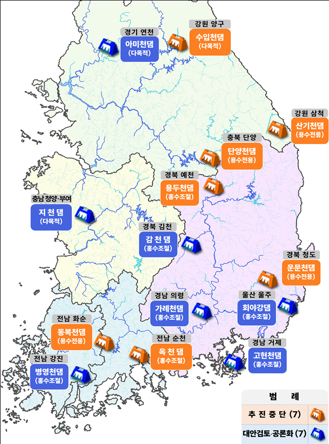 지난 정부 때 이미 추진을 중단한 3개 댐(양구군 수입천댐ㆍ단양군 단양천댐ㆍ순천시 옥천댐)을 더하면 애초 짓기로 한 14개 댐 중 절반이 백지화된 것이다. 이에 따라 4조7000억원에 달하던 사업비는 2조원 수준으로 줄어든다.