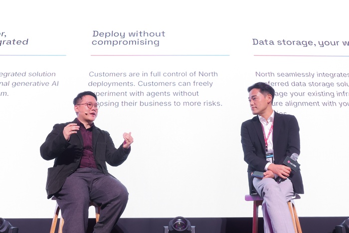 AX전문기업 LG CNS(대표 현신균)가 30일 서울 여의도 콘래드 호텔에서 기업 고객 초청 행사 ‘AX 페어(AX Fair) 2025’를 열고, 에이전틱(Agentic) AI와 피지컬(Physical) AI 기반의 최신 AX 혁신 사례를 발표했다. 이날 행사는 제조, 물류, 금융, 유통, 공공, 헬스케어 등 다양한 산업 분야 기업 관계자 1000여명이 참석했다. 30일 여의도 콘래드호텔에서 열린 LG CNS 고객초청 행사 ‘AX페어 2025’에서 LG CNS AI센터장 진요한 상무(오른쪽)와 코히어 공동 창업자 아이반 장)이 대담을 진행하고 있는 모습. /사진:LG CNS |