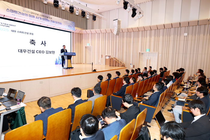 김보현 대우건설 대표가 30일 서울 을지로 본사에서 열린 ‘2025 대우건설 스마트건설 포럼’에서 축사를 하고 있다. / 대우건설 제공 |