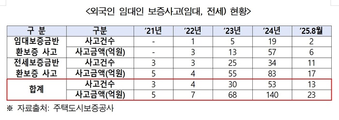 보증 사고액 역시 △2021년 5억원 △2022년 7억원 △2023년 58억원으로 증가했고, 지난해엔 무려 140억원에 달했다. 올해도 8월까지 23억원(13건)에 달하는 것으로 집계됐다.