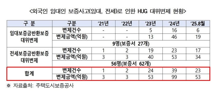 이처럼 외국인 임대인의 보증사고가 급증하면서 외국인 임대인을 대신해 HUG가 임차인에게 전세금을 대신 갚아준 대위변제 역시 2021년 4억원(1건)에서 2024년 99억원(39건)으로 크게 늘었다. 지난 5년간(21년∼25년 8월) HUG 대위변제액만 211억원에 달한다.