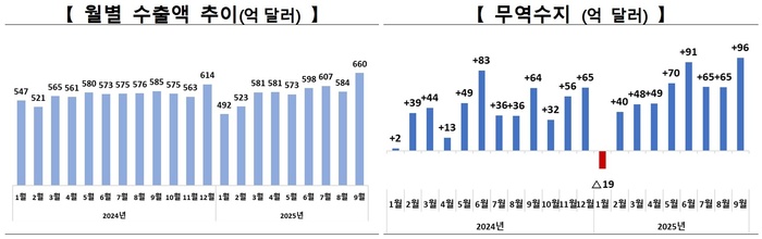 15대 주요 수출 품목 중에서는 반도체가 22.0% 증가한 166억1000만달러로 역대 최고를 찍었다. 자동차도 16.8% 오른 64억달러였으며 9월 기준 최대 및 4개월 연속 상승 흐름을 이어갔다.
