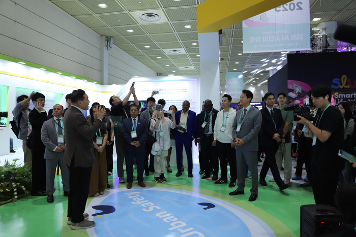 | 최은수 인텔리빅스 대표이사(왼쪽)가 서울 코엑스에서 열린 스마트라이프위크에서 인텔리빅스의 Gen AMS 솔루션을 오세훈 서울시장 (오른쪽)에게 설명하고 있다. /사진 = 인텔리빅스 제공 |
