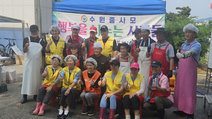 자장면 봉사를 위해 모인 수원 중사모 봉사자들. / 사진 : 박범천 기자 |