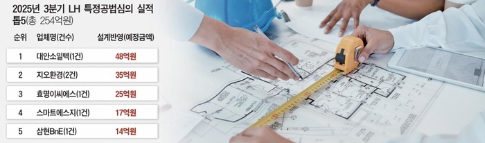 [대한경제=손민기 기자]지반강화 전문업체 대안소일텍이 올 3분기 한국토지주택공사(LH) 특정공법 심의에서 48억원 규모 1건의 설계반영으로 수주킹에 올랐다. 지오환경, 효명이씨에스, 스마트에스지, 삼현BnE 등도 상위권에 포진했다.