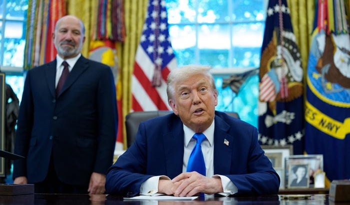 지난 19일(현지시간) 미국 백악관에서 도널드 트럼프(가운데) 미국 대통령이 투자이민 프로그램 ‘트럼프 골드 카드’를 발표하는 가운데 주무 부처인 상무부의 하워드 러트닉(왼쪽) 장관이 지켜보고 있다./사진:EPA=연합뉴스 |