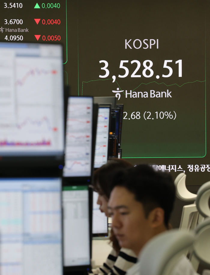 코스피가 장중 3,500선을 돌파한 2일 서울 중구 하나은행 딜링룸에서 딜러들이 모니터를 주시하고 있다./사진:연합뉴스 |