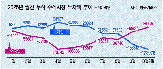 반면 개인투자자의 국내 증시 이탈은 지속되고 있다. 올해 들어 개인투자자는 국내 주식시장에서 17조8977억원을 순매도했다. 지난 7월부터 지난달까지 16조5437억원을 순매도한 개인투자자는 이달에도 매수액보다 매도액이 4조2465억원 더 많았다.