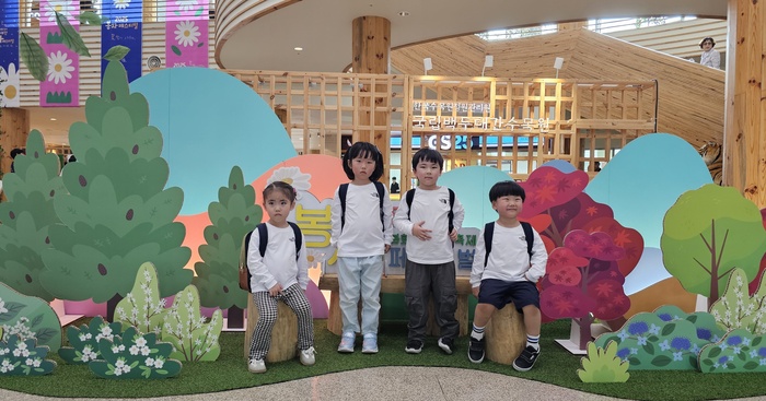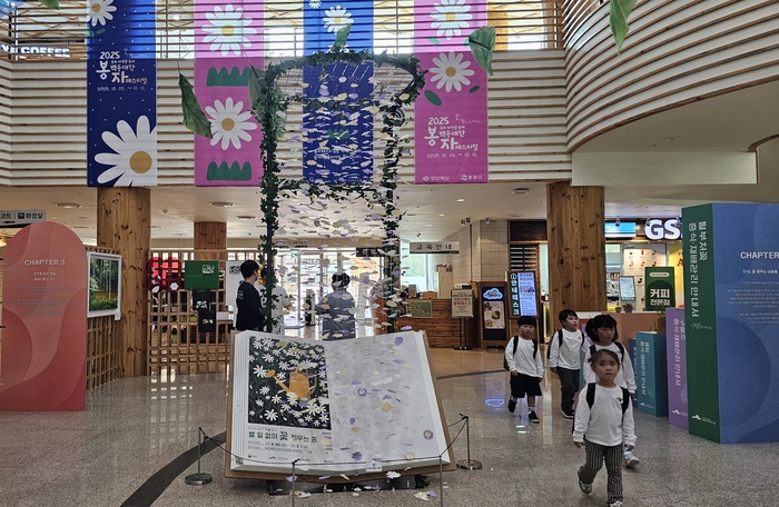 국립백두대간수목원, 봉자페스티벌을 보기 위해 방문자 센터에 설치된 봉자에 관련한 대형 책자를 형상화 한 옆으로 어린 아이들이 지나가고있는 모습 입니다. / 사진 : 류효환 기자 |