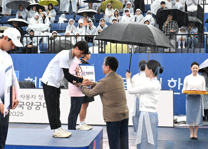 | 장재훈 현대차그룹 부회장이 3일 광주 동구 5.18 민주광장 특설경기장에서 열린 ‘현대자동차 정몽구배 한국양궁대회 2025’ 남자 리커브 결승전에서 우승을 차지한 김종우 선수에게 우승 트로피를 수여하며 축하하고 있다./사진: 현대차 제공 |