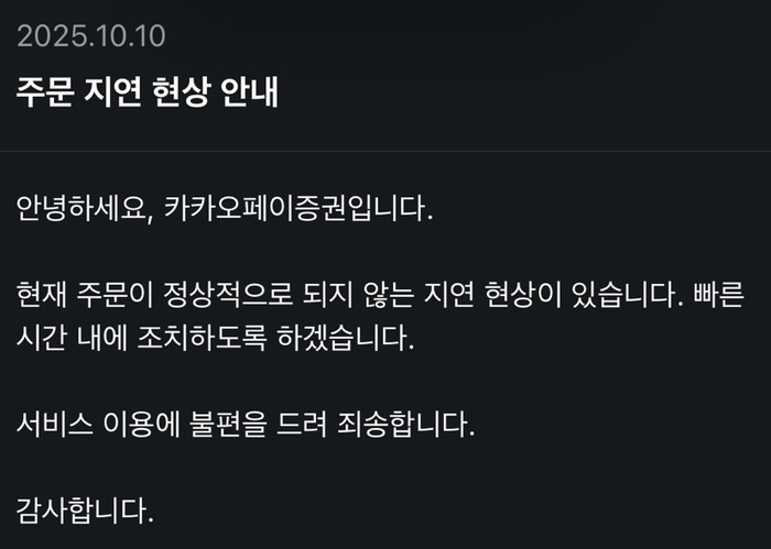 카카오페이증권 측은 공지사항을 통해 “현재 주문이 정상적으로 되지 않는 지연 현상이 있다”며 “빠른 시간 내에 조치하도록 하겠다”고 밝혔다.