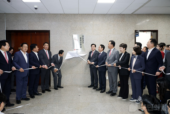10일 오전 국민의힘 장동혁 대표와 송언석 원내대표가 원내대표단과 함께 서울 여의도 국회 원내대표실 앞에서 국정감사 종합상황실 현판 제막식을 열고 있다./사진:국민의힘 |