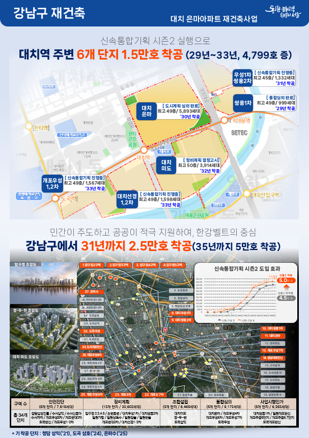 이미 청담 삼익(2021년), 도곡 삼호(2024년), 은하수(2025년) 아파트는 시공 중이며, 대치쌍용1차 등 5개 단지 6263세대는 사업시행인가를 준비 중이다. 5개 단지, 9172세대는 통합심의를 준비하고 있다.