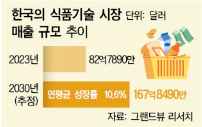 글로벌 시장조사 기관 ‘그랜드뷰 리서치’는 한국의 식품기술 시장이 2023년 82억7890만달러(11조8280억원)의 수익을 냈으며, 이 규모가 2030년 167억8490만달러(24조원)로 커질 것으로 내다봤다. 이 공동회장은 “농업·식품 기업뿐만 아니라 먹기 위한 기술을 제공하는 삼성전자부터 야놀자까지 모든 테크산업이 연결된다”고 설명했다.