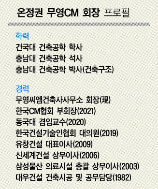 온정권 무영씨엠건축사사무소(이하 무영CM) 회장은 최근 과천사옥에서 가진 <대한경제>와의 인터뷰에서 “CM의 본질은 결국 사람과 신뢰”라며 “AIㆍBIM 기반의 스마트CM을 앞세워 글로벌 시장에서도 새 모델을 세워가겠다”며 이같이 강조했다. 올해 창립 40주년을 맞은 회사는 투명경영과 기술혁신을 축으로 새롭게 도약한다는 목표다.