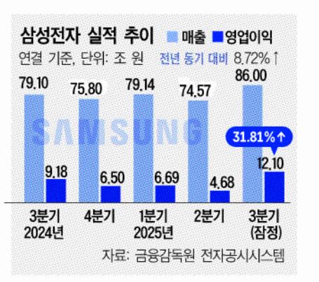 삼성전자는 14일 잠정실적 공시를 통해 올해 3분기 연결기준 매출 86조원, 영업이익 12조1000억원을 기록했다고 밝혔다. 매출은 전년 동기 대비 8.72% 증가했고, 영업이익은 31.81% 늘었다. 전 분기 영업이익(4조6800억원)과 비교하면 158.55% 급증했다. 삼성전자의 분기 영업이익이 10조원대를 회복한 것은 2022년 2분기(14조1000억원) 이후 3년 만이다.
