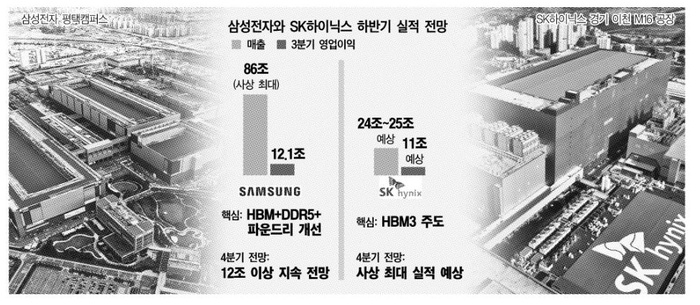 삼성전자의 실적 반등은 SK하이닉스의 고공 행진과 맞물리며 글로벌 메모리 반도체 시장이 ‘빅2’ 중심으로 재편되는 흐름을 더욱 뚜렷하게 만들고 있다. SK하이닉스는 오는 27일 예정된 3분기 실적 발표에서 창사 이래 처음으로 분기 영업이익 10조원 돌파가 유력시된다. 증권가는 매출 24조~25조원, 영업이익 11조원 안팎을 전망하고 있고, 이는 전년 동기 대비 각각 38%, 59% 증가한 수치다.