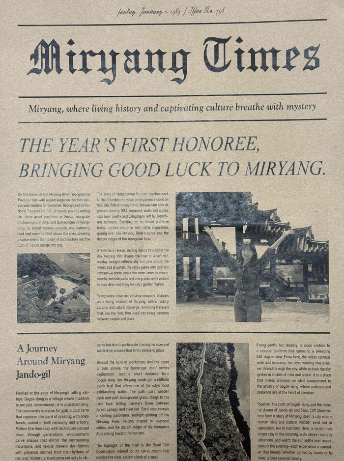 이경숙 관광진흥과장은 “신문 속 주인공이 되는 특별한 경험을 통해 관광객이 밀양의 매력을 새롭게 느끼고, 다시 방문하고 싶은 도시로 기억되길 바란다”라고 말했다.
