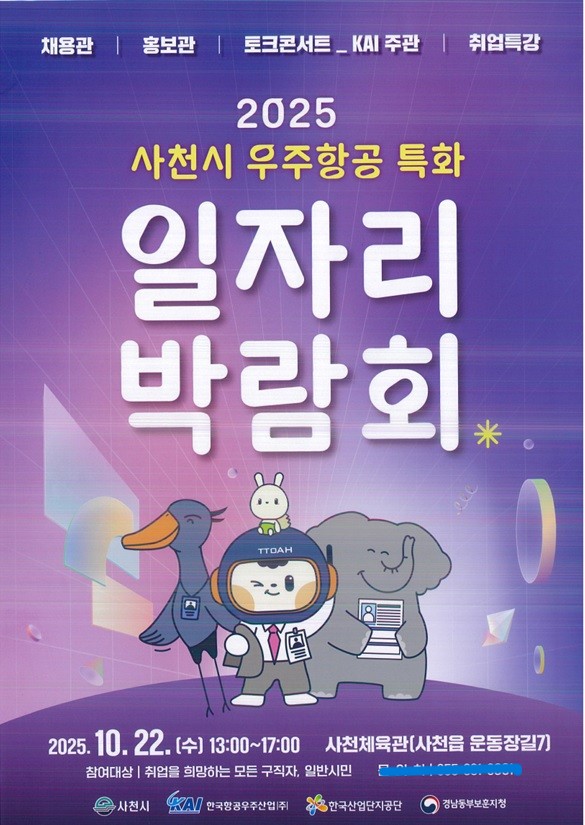 사천시는 오는 22일 사천체육관에서 항공산업 중심의 청년 고용기회 확대를 위해 ‘2025년 사천시 우주항공특화 일자리박람회’를 개최한다고 15일 밝혔다.