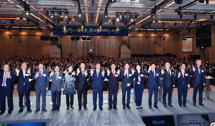 15일 인천 인스파이어 엔터테인먼트 리조트 인스파이어 볼룸에서 열린 '제1회 전문건설의 날' 기념행사에서 주요 내빈 및 관계자들이 기념촬영을 하고 있다. / 사진: 안윤수기자 |