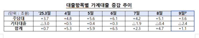 16일 금융당국이 발표한 ‘2025년 9월 중 가계대출 동향(잠정)’에 따르면 9월 가계대출 증가 규모는 1조1000억원으로, 전월(+4조7000억원)과 전년 동월(+5조4000억원) 대비 크게 줄었다.