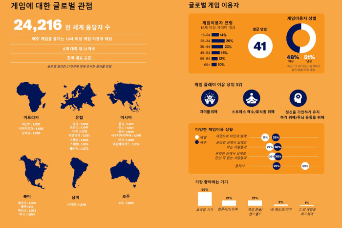 협회는 미국, 중국, 일본 등 세계 3대 게임 시장과 프랑스, 캐나다 등 전세계 21개국 게임 협단체와 16세 이상 게임 이용자 2만4000여명을 대상으로 조사를 진행했다.