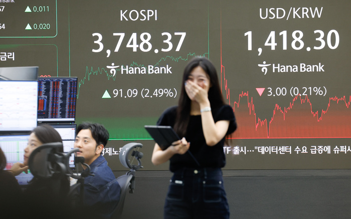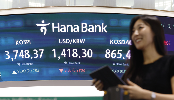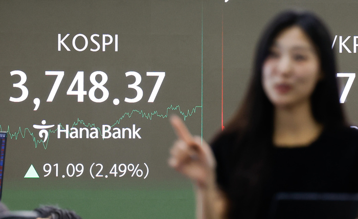 코스피가 3,700선을 돌파하며 사상 최고치를 기록한 16일 서울 중구 하나은행 딜링룸 현황판에 코스피 지수 등이 표시되고 있다. 코스피는 전장 종가보다 91.09 포인트(2.49%) 상승하며 3748.37로, 코스닥은 0.69 포인트(0.08%) 상승한 865.41로 장을 마감했다.