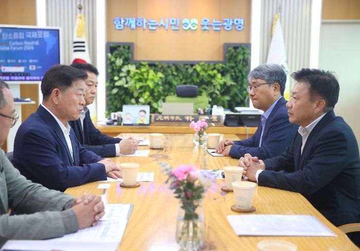 박승원 광명시장이 지난 16일 오후 시장 집무실에서 송치영 포스코이앤씨 사장과 면담을 갖고 있다. / 사진 : 광명시 제공 |