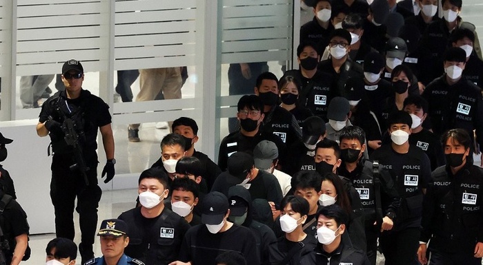 인천공항에는 이날 새벽부터 피의자들을 태울 호송용 승합차 23대가 대기했다. 경찰 기동대 등도 대거 배치됐고, 경찰청은 수사기획조정관(치안감)을 단장으로 하는 공항현장대응단 인력 215명도 배치했다.