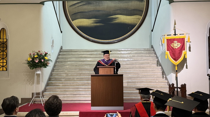 | 구자열 LS 이사회 의장이 18일 와세다대로부터 명예 법학박사 학위를 받고 답사를 하고 있다./사진: LS그룹 제공 |