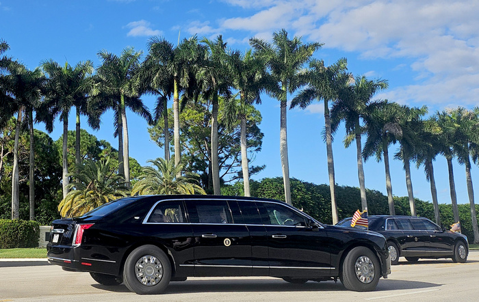 | 18일(현지시간) 한국의 4대 그룹 총수 등 아시아 기업 대표들과 ‘트럼프 인터내셔널 골프 클럽’에서 라운딩을 마치고 나오는 도널드 트럼프 미국 대통령의 차량 행렬./사진: 연합 |