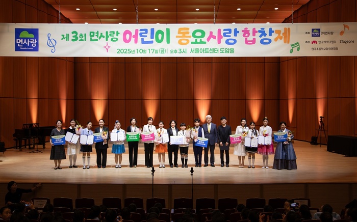 | 지난 17일 서울아트센터에서 열린 '제3회 어린이 동요사랑 합창제'에서 수상자들이 기념촬영을 하고 있다./사진=면사랑 |