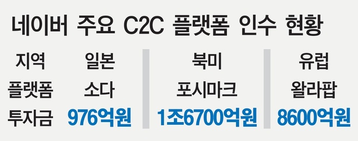 네이버는 한국과 일본에서 한정판 거래 플랫폼 크림과 소다를, 북미에서 소셜 커머스 포시마크를 운영하고 있다. 지난 8월에는 스페인 중고거래 플랫폼 왈라팝을 인수했다. 다만 인수에 13억1000만 달러(1조8636억원)를 들인 포시마크가 실적 부진에 빠지고, 5억6300만 유로(9036억원)를 쓴 왈라팝 지분 취득이 스페인 정부 심사 과정에서 내년으로 지연됐다.