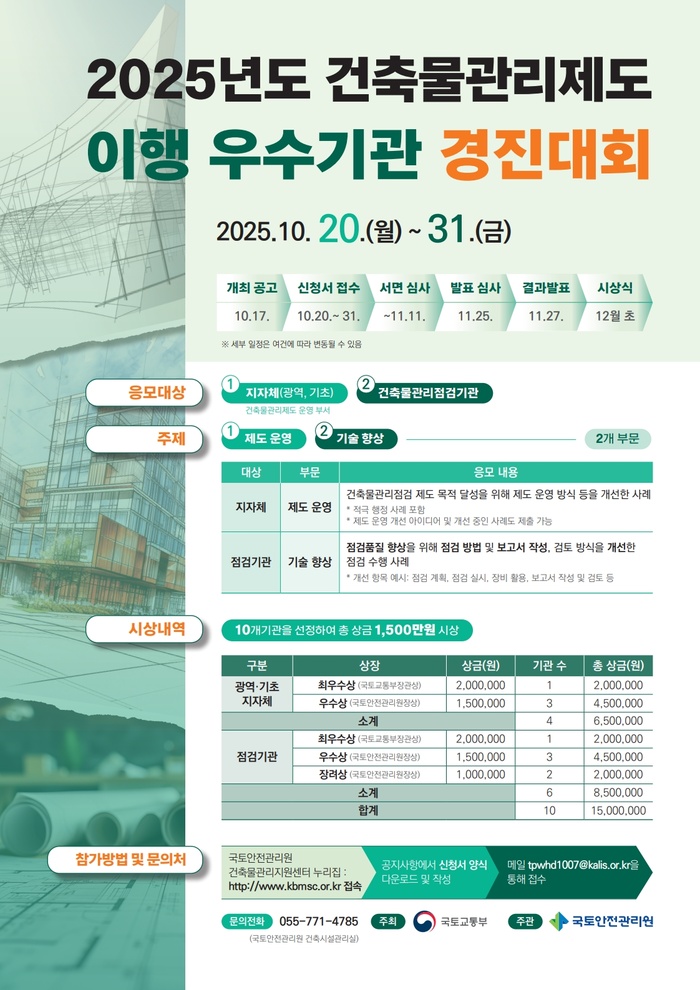 지자체 부서와 건축물관리점검기관을 대상으로 하는 이번 경진대회는 제도운영과 기술향상 부문으로 나눠 진행되며, 접수는 오는 31일까지다.