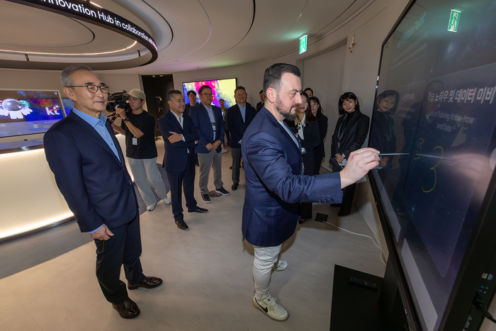 | KT가 국내 산업계 AX를 위한 KT 이노베이션 허브를 KT 광화문 West 빌딩에 개소했다. KT와 마이크로소프트 임직원들은 20일 개소식에 참석해 AX 관련 전시물을 관람했다. 사진은 KT 김영섭 대표(왼쪽)와 마이크로소프트 마르코 마이모네(오른쪽)가 KT 이노베이션 허브의 전시물을 체험하는 모습. /사진:KT |