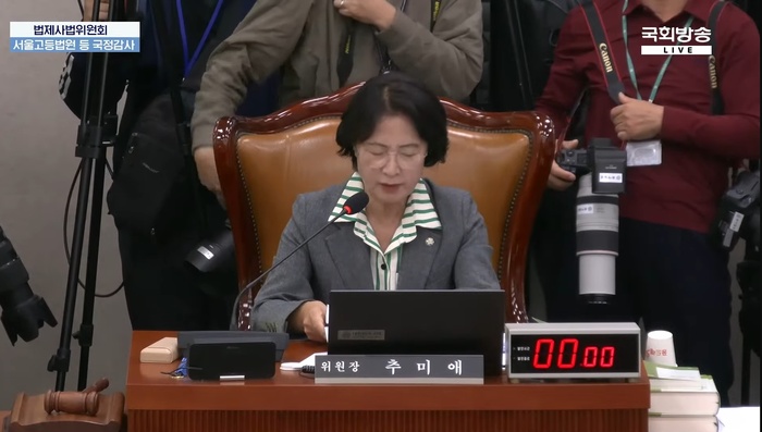 20일 국회 법제사법위원회 국정감사에서 추미애 위원장이 발언하고 있다./사진:국회방송 중계화면 캡처 |