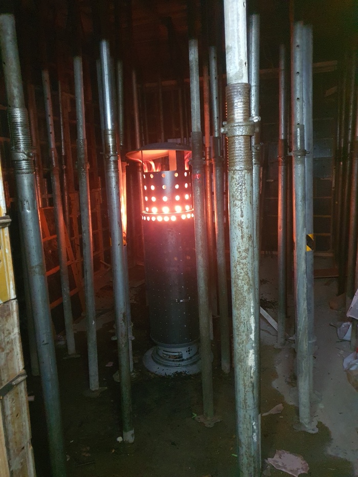 건설현장에 설치된 콘크리트 양생용 목재팰릿 난로./ 공존공영 제공