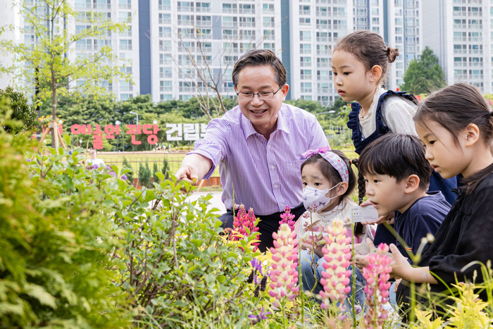 | 서울 영등포구 문래동 꽃밭정원에서 어린이들에게 초화류를 설명하고 있는 최호권 영등포구청장. / 사진 : 영등포구 제공 |