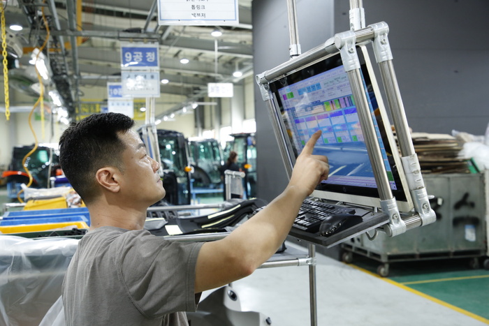 | 농기계 제조업체 위제스(전북 익산 소재) 직원이 관리 시스템을 통해 생산 공정을 제어하고 있다. /사진:삼성전자 |