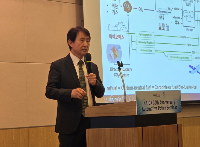 | 배충식 KAIST 기계공학과 교수가 한국수입자동차협회(KAIDA) 창립 30주년 세미나에서 발표하고 있다./사진: 강주현 기자 |
