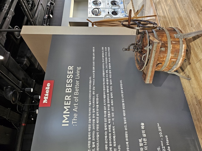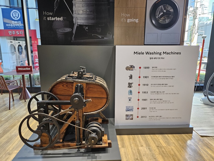 | 독일 가전 브랜드 밀레(Miele)는 22일 오전 서울 밀레 익스피리언스센터 강남에서 밀레코리아 20주년 기자간담회를 갖고 밀레의 목재 세탁기를 전시했다. 밀레는 1901년에 목재 세탁기(wooden washing machine)를 처음 개발·출시했다. 심화영기자 |
