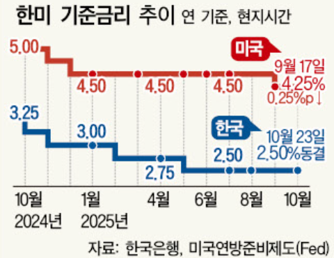 한은은 앞서 상반기 두 차례 인하로 완화 기조를 이어왔지만, 하반기 가계부채와 부동산시장 불안이 심화되자 7월과 8월에 이어 이번까지 세 차례 연속 금리를 묶었다.